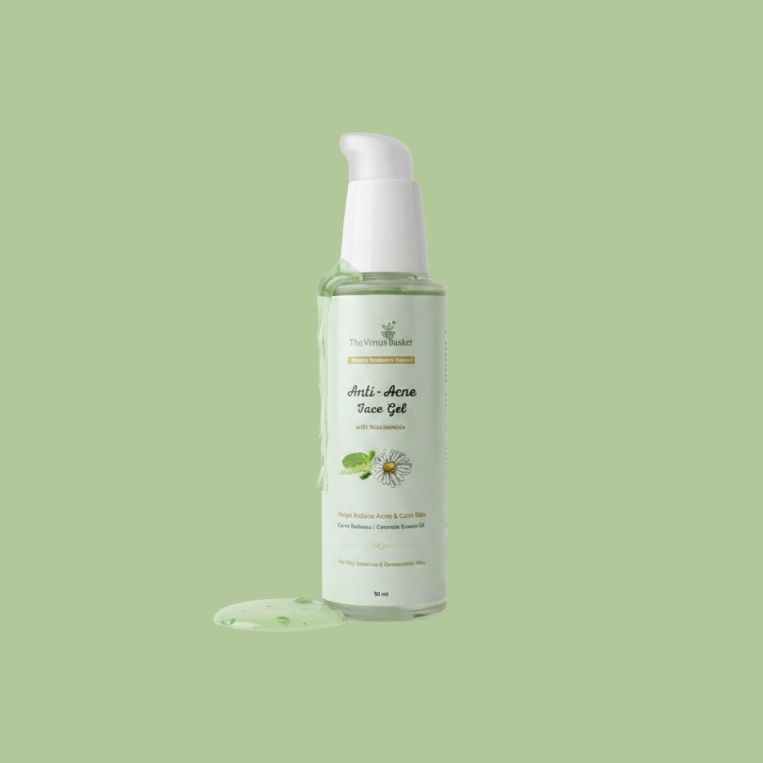 At The Venus Basket, we believe skincare begins with nature’s purity. This Anti‑Acne Face Gel combines Tea‑Tree Hydrosol to help reduce the look of blemishes and Niacinamide to help balance oil and refine pores. A soothing blend of Lavender, Tulsi, Chamomile, Cucumber, and Aloe Vera comforts acne‑prone skin, while Green Tea, Neem, and Turmeric provide gentle antioxidant support for a clearer, calmer, more balanced complexion.